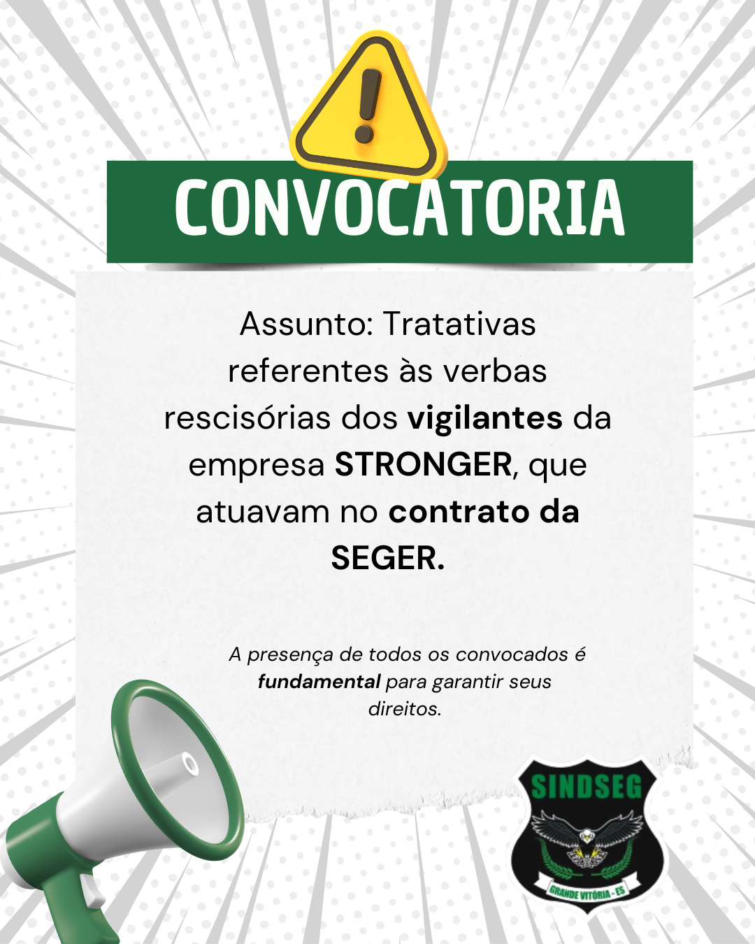 Assunto: Tratativas referentes às verbas rescisórias dos vigilantes da empresa STRONGER, que atuavam no contrato da SEGER.