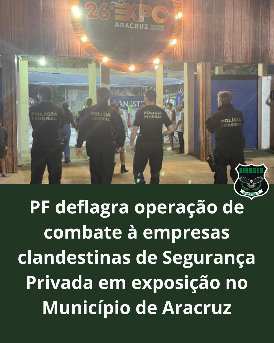 Policiais federais lotados na Delegacia de Controle de Segurança Privada, na quinta-feira (7/8), realizaram fiscalização de combate à empresas clandestinas de segurança privada no local onde ocorreu a 26ª Exposição do Município de Aracruz, deflagrando a Operação Segurança em Foco III.Os policiais federais constataram que a empresa que vinha prestando o serviço de segurança privada no camarote do evento, arrendado para empresa privada, não possuía autorização da Polícia Federal, tendo resultado na lavratura de 01 auto de encerramento da atividade de segurança privada, em face da utilização de 30 vigilantes irregulares no local.