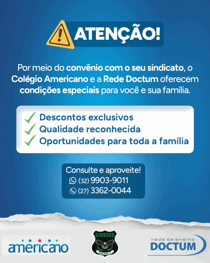 O Sindseg firmou a renovação do convênio de parceria com a Rede de Ensino Doctum – Instituto Ensinar Brasil, garantindo descontos exclusivos para associados, dependentes e parceiros.