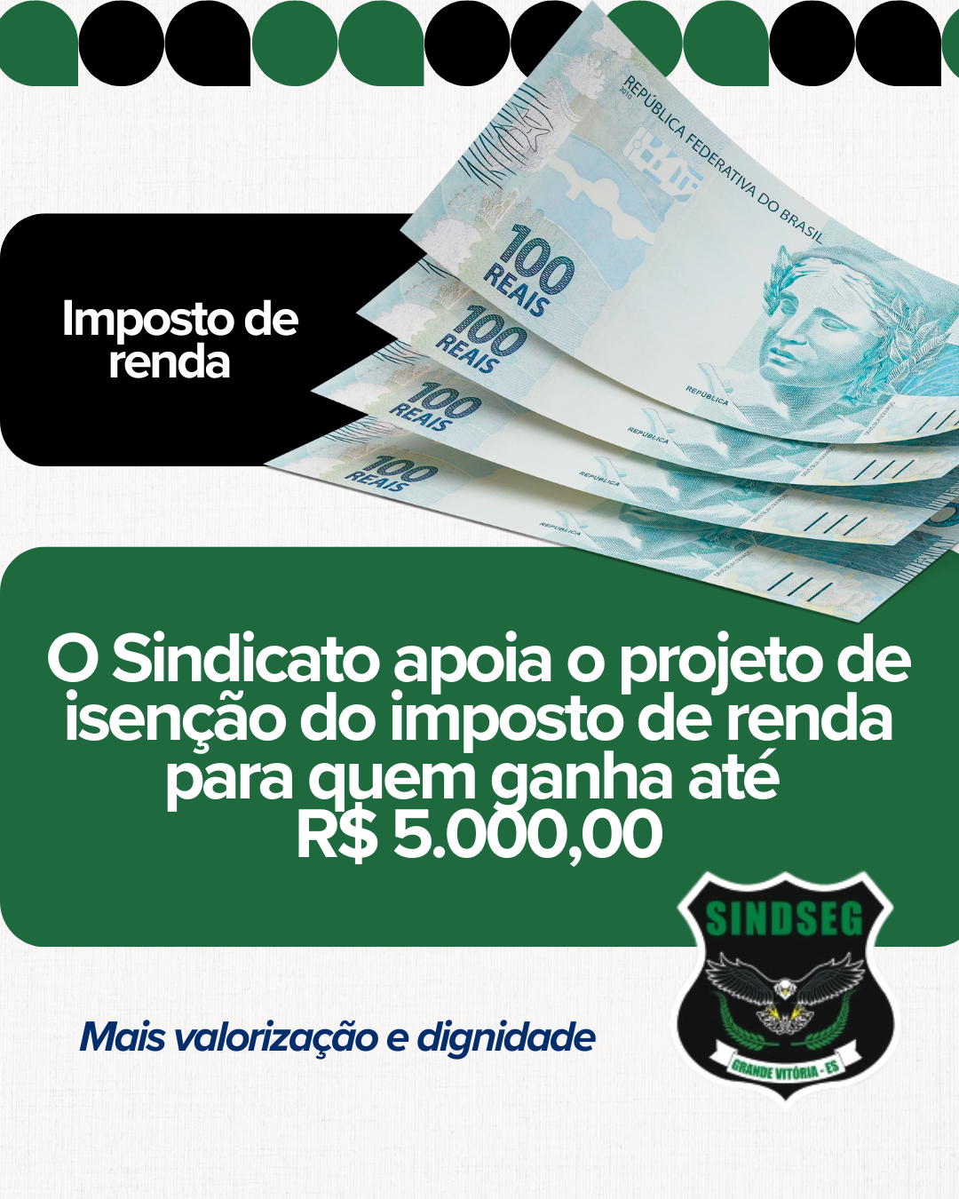 O Sindicato dos Vigilantes do Espírito Santo manifesta total apoio ao Projeto de Lei encaminhado pelo presidente Luiz Inácio Lula da Silva ao Congresso Nacional, que prevê a isenção do Imposto de Renda para trabalhadores com renda mensal de até R$ 5.000,00.